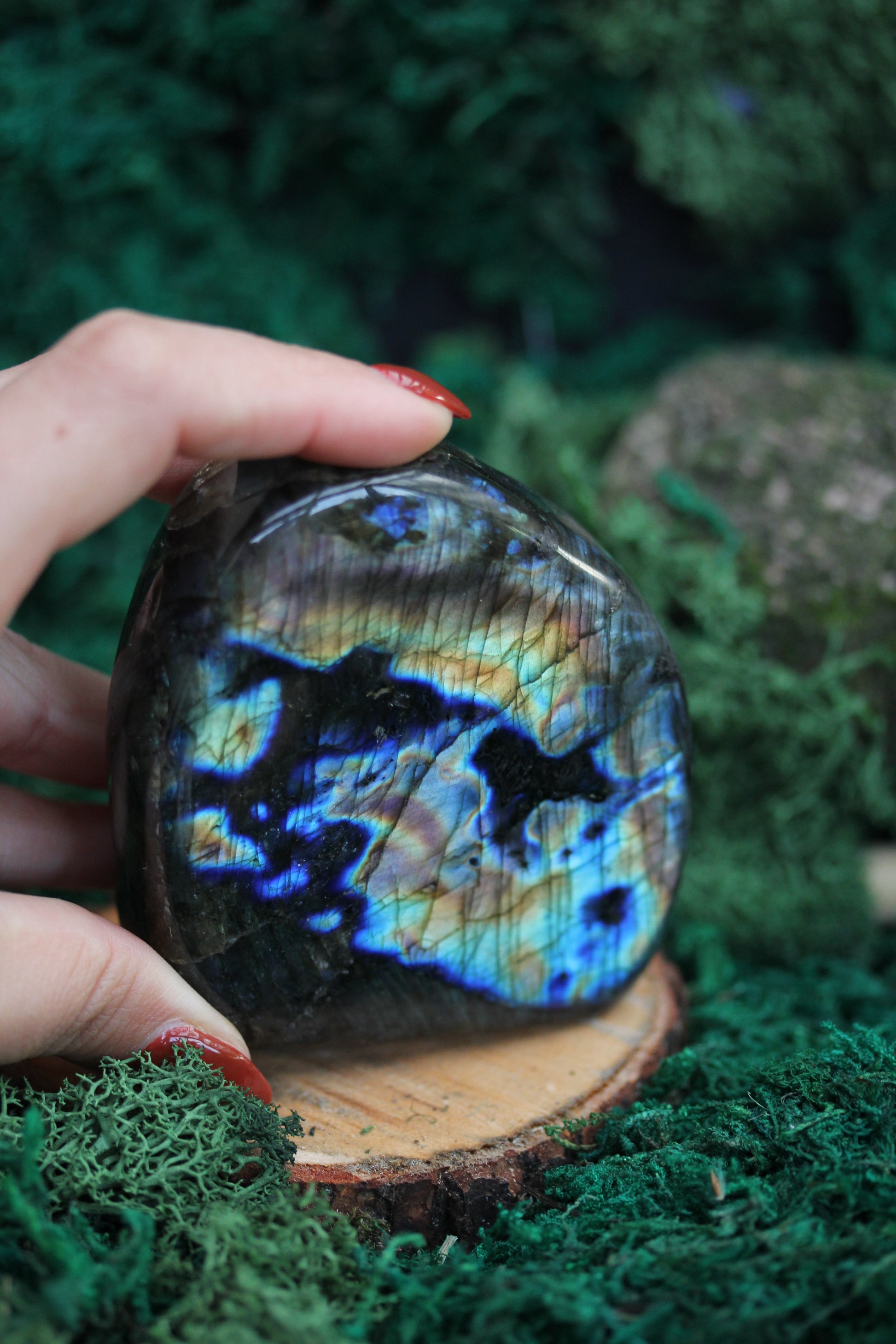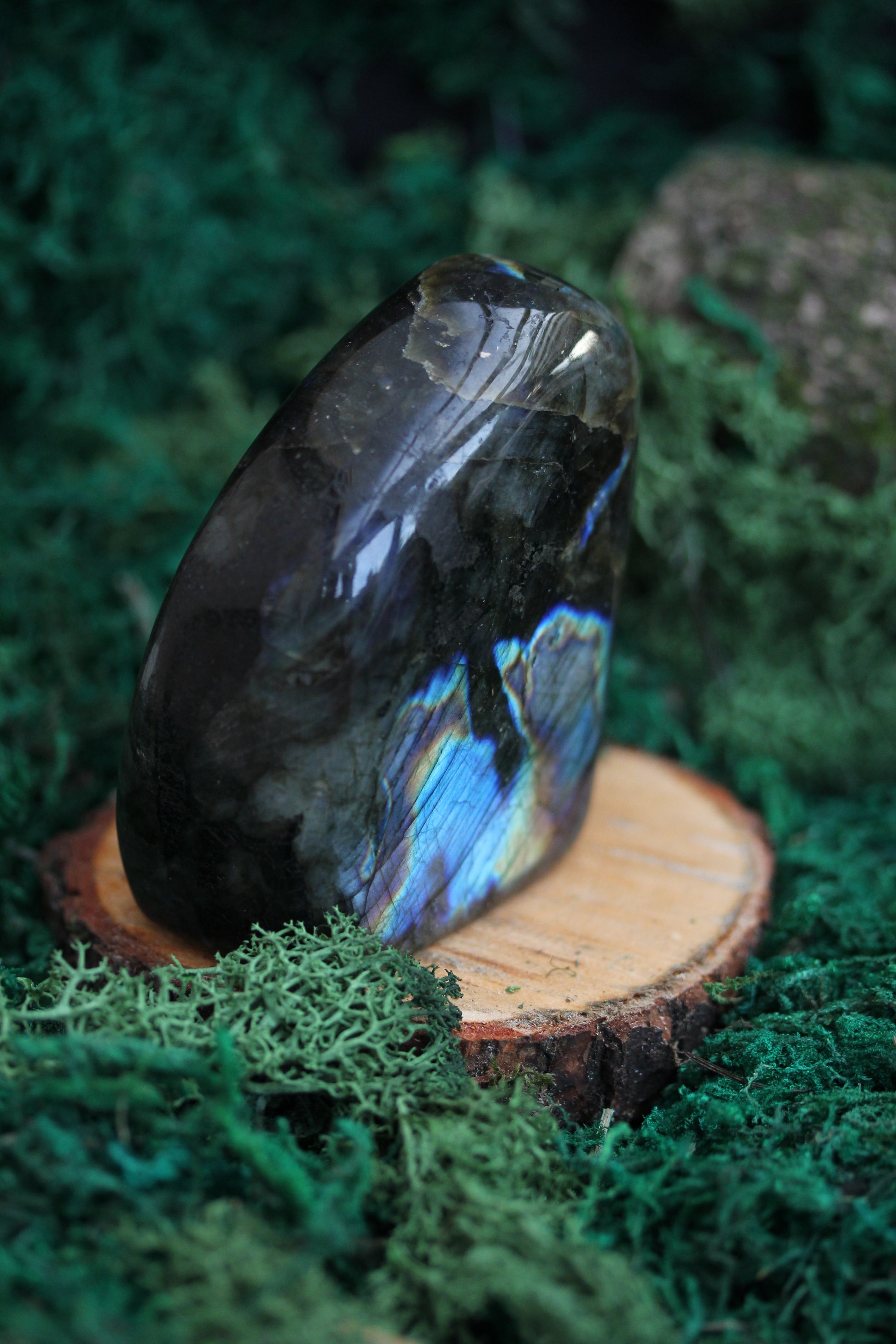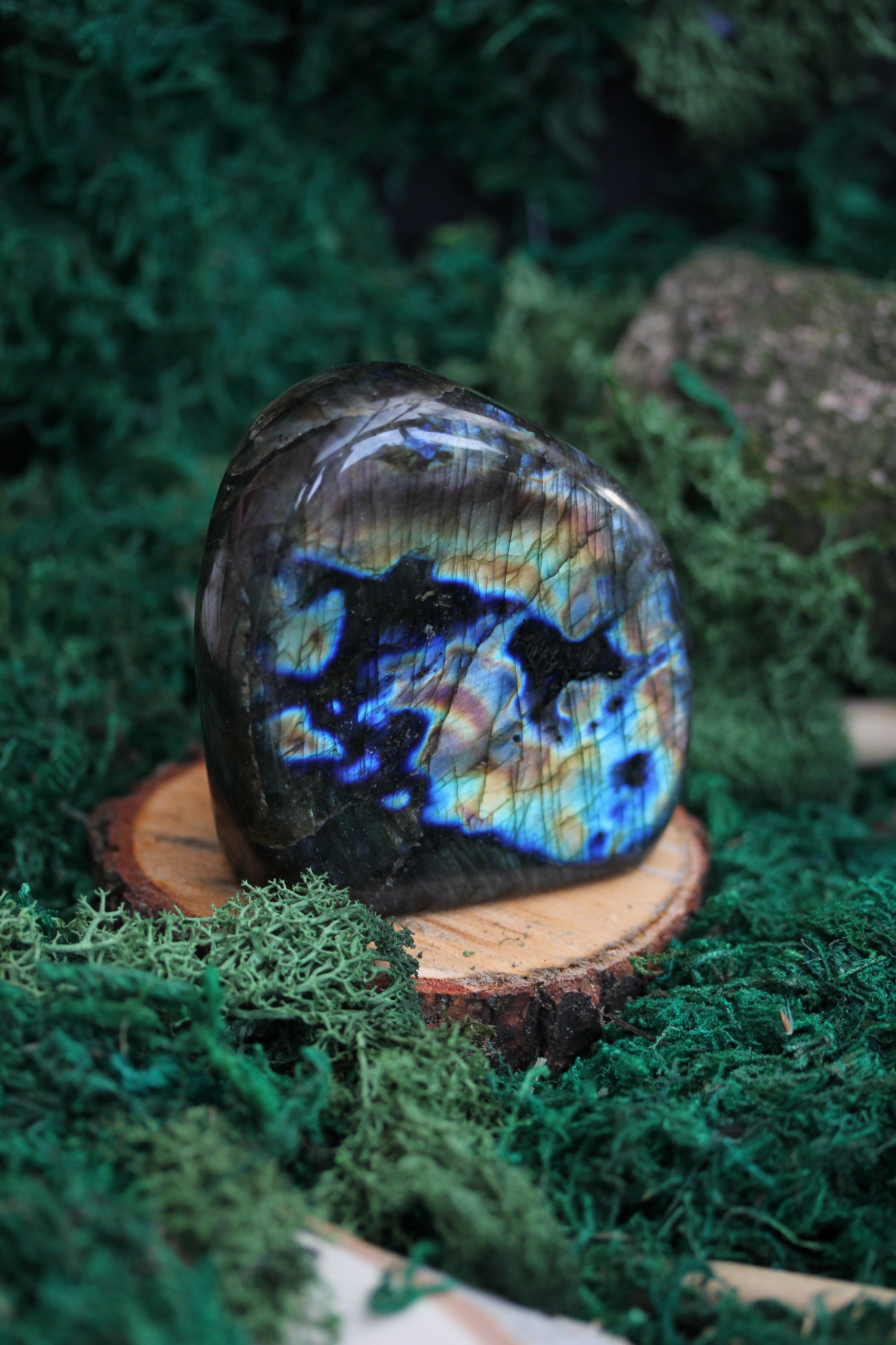 In the heart of a moonlit forest, nestled amidst ancient, whispering trees, there lies a hidden treasure, a Blue Labradorite Freeform Crystal that seems to hold the secrets of the cosmos. Its beguiling shades of blue are reminiscent of the serene lakes where legends of old speak of ethereal beings who danced upon the water's surface.