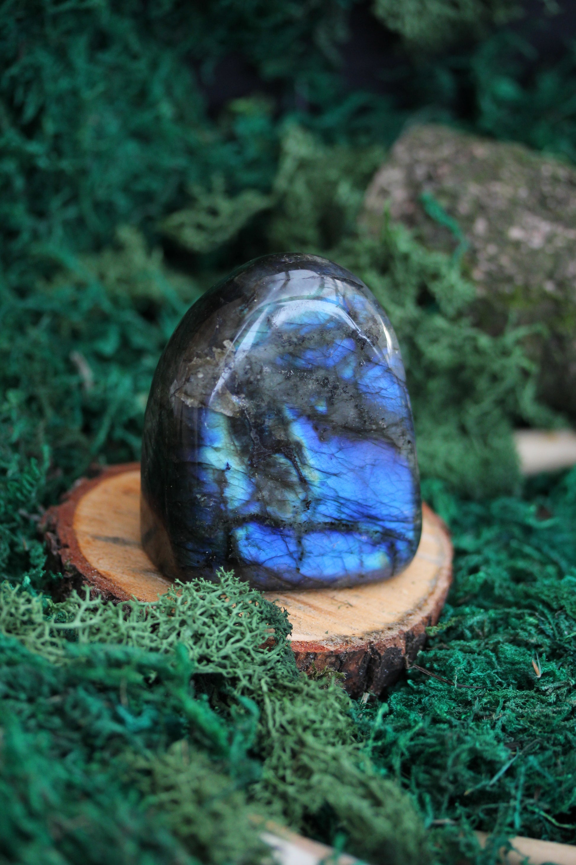In the heart of a moonlit forest, nestled amidst ancient, whispering trees, there lies a hidden treasure, a Blue Labradorite Freeform Crystal that seems to hold the secrets of the cosmos. Its beguiling shades of blue are reminiscent of the serene lakes where legends of old speak of ethereal beings who danced upon the water's surface.