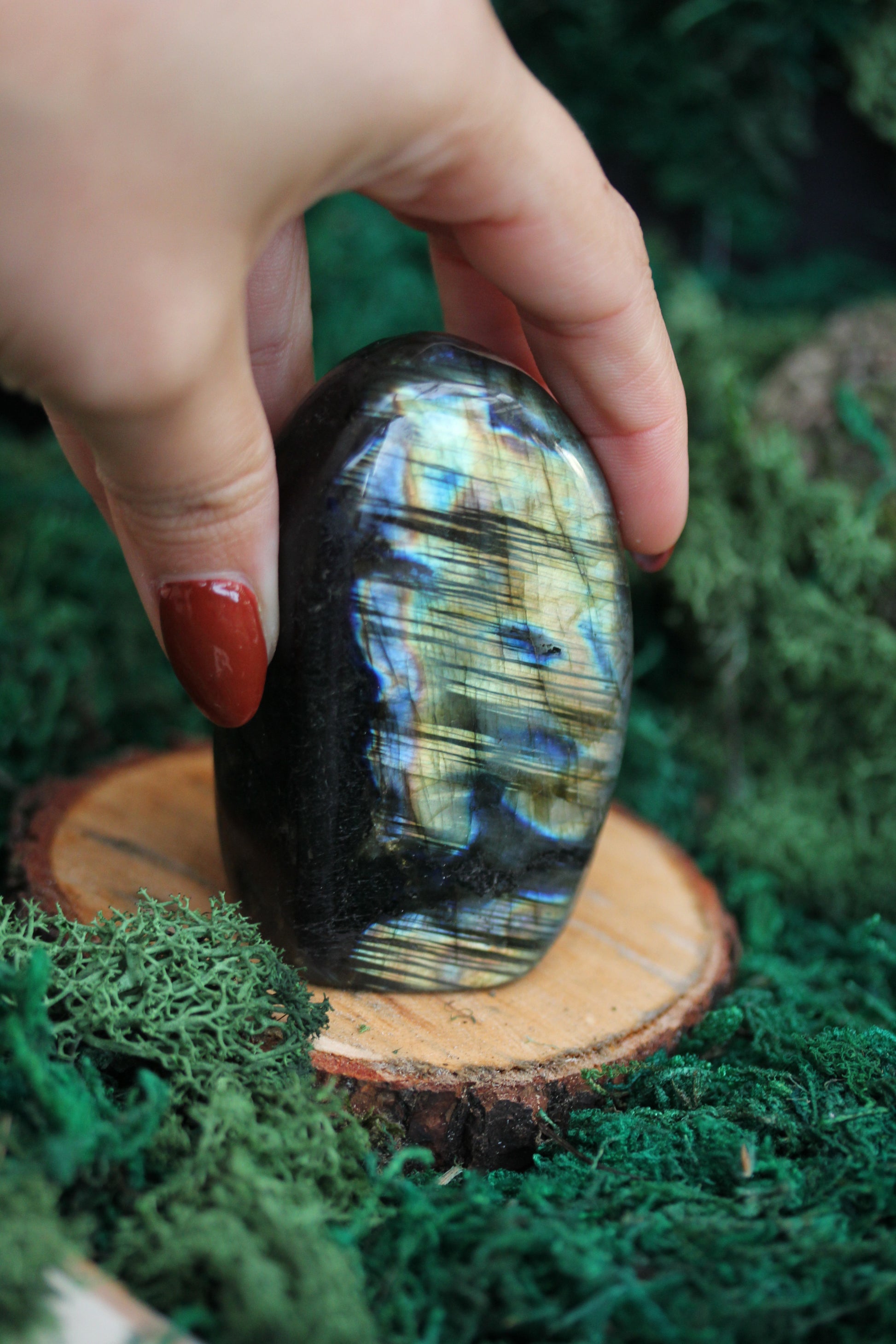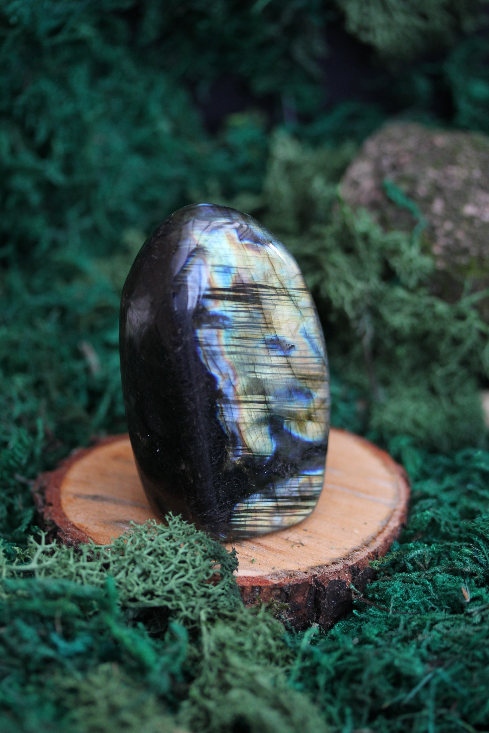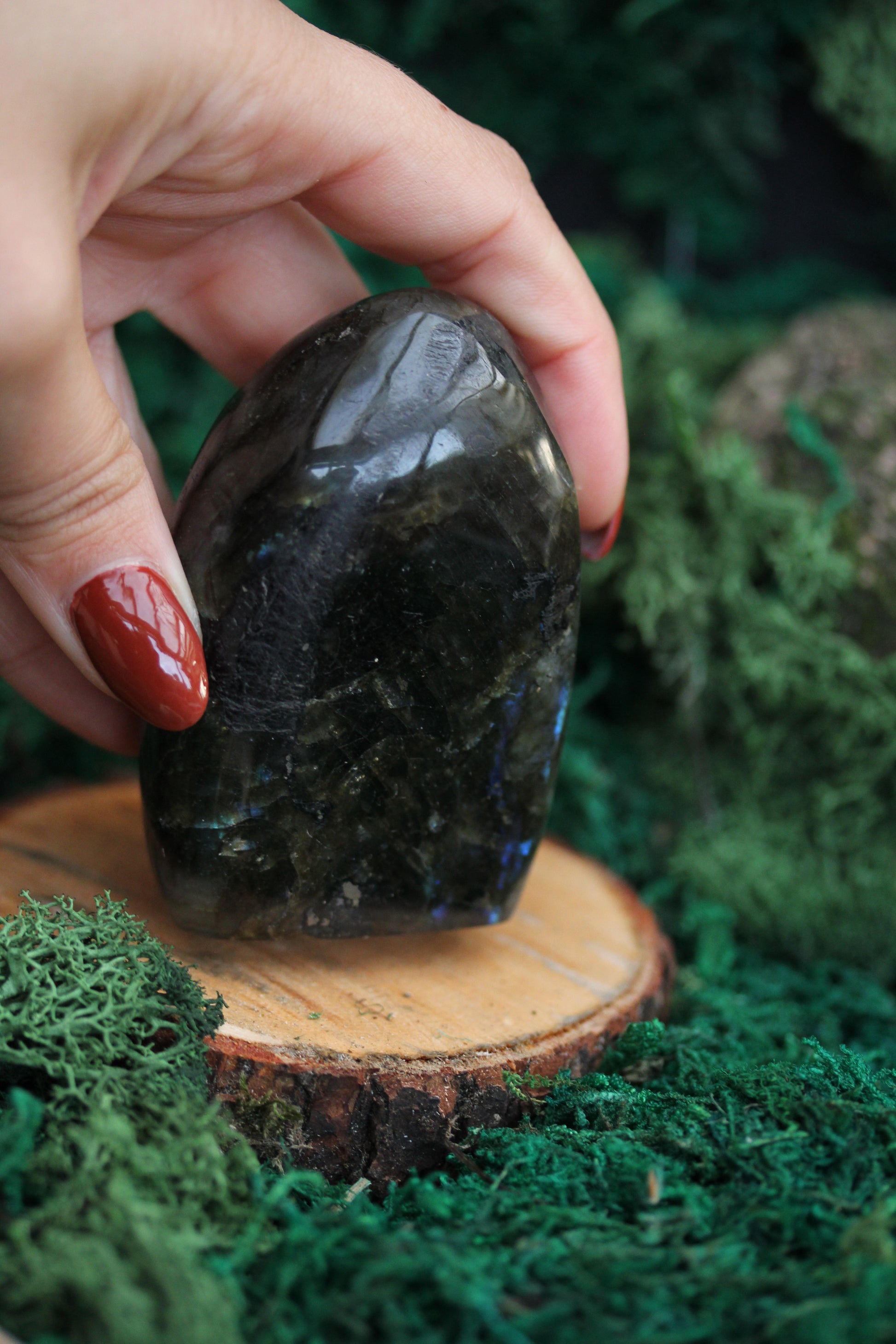 In the heart of a moonlit forest, nestled amidst ancient, whispering trees, there lies a hidden treasure, a Blue Labradorite Freeform Crystal that seems to hold the secrets of the cosmos. Its beguiling shades of blue are reminiscent of the serene lakes where legends of old speak of ethereal beings who danced upon the water's surface.