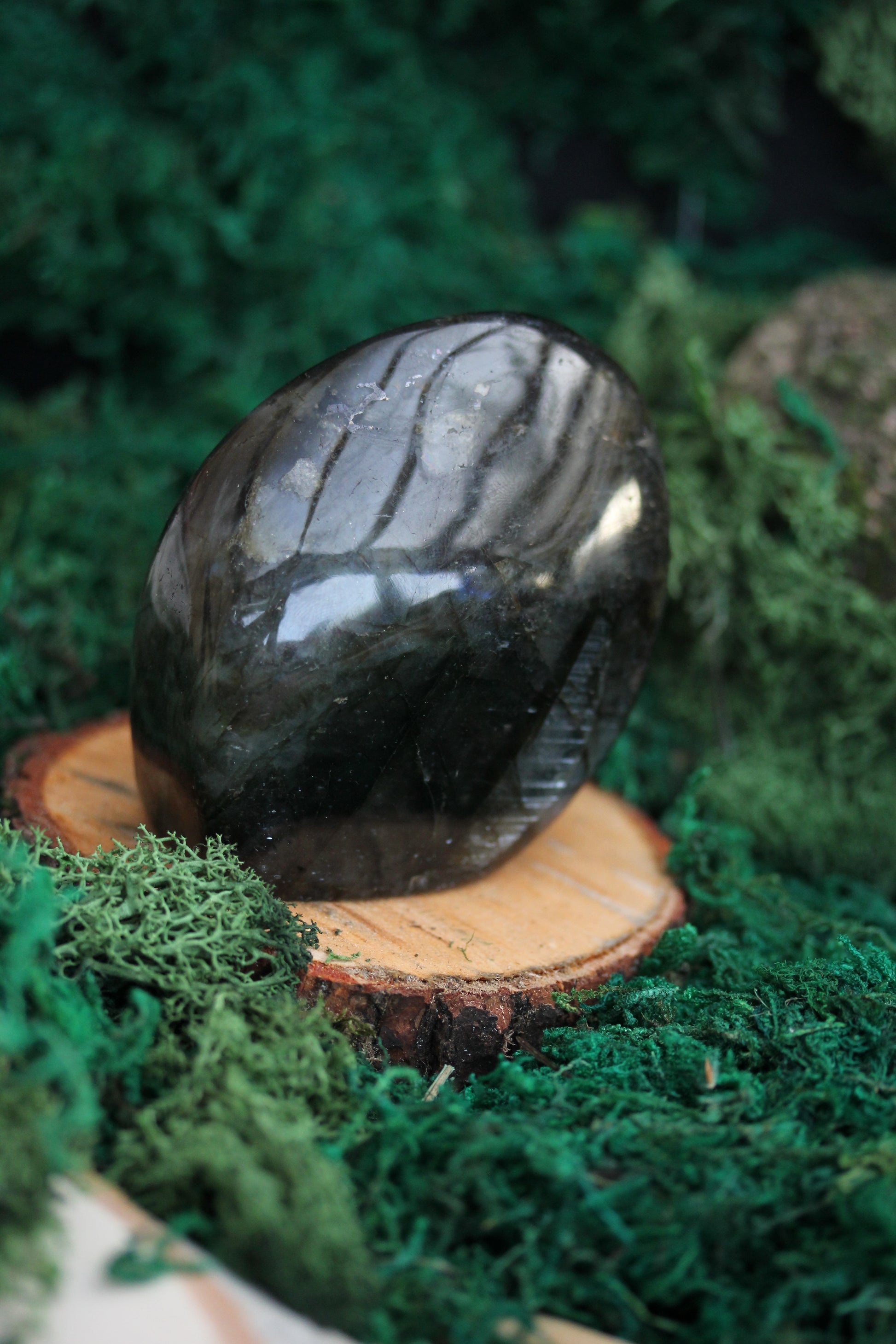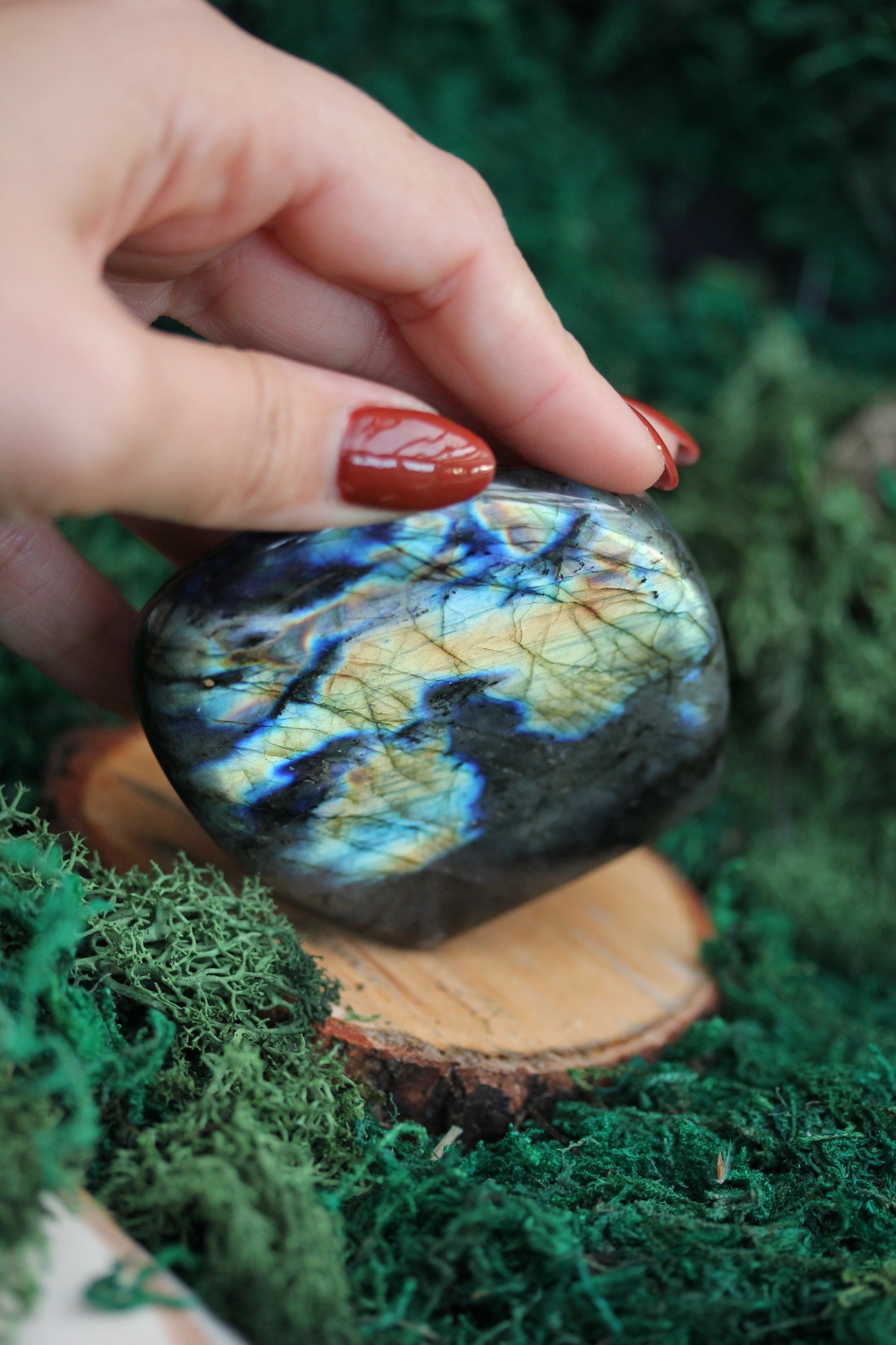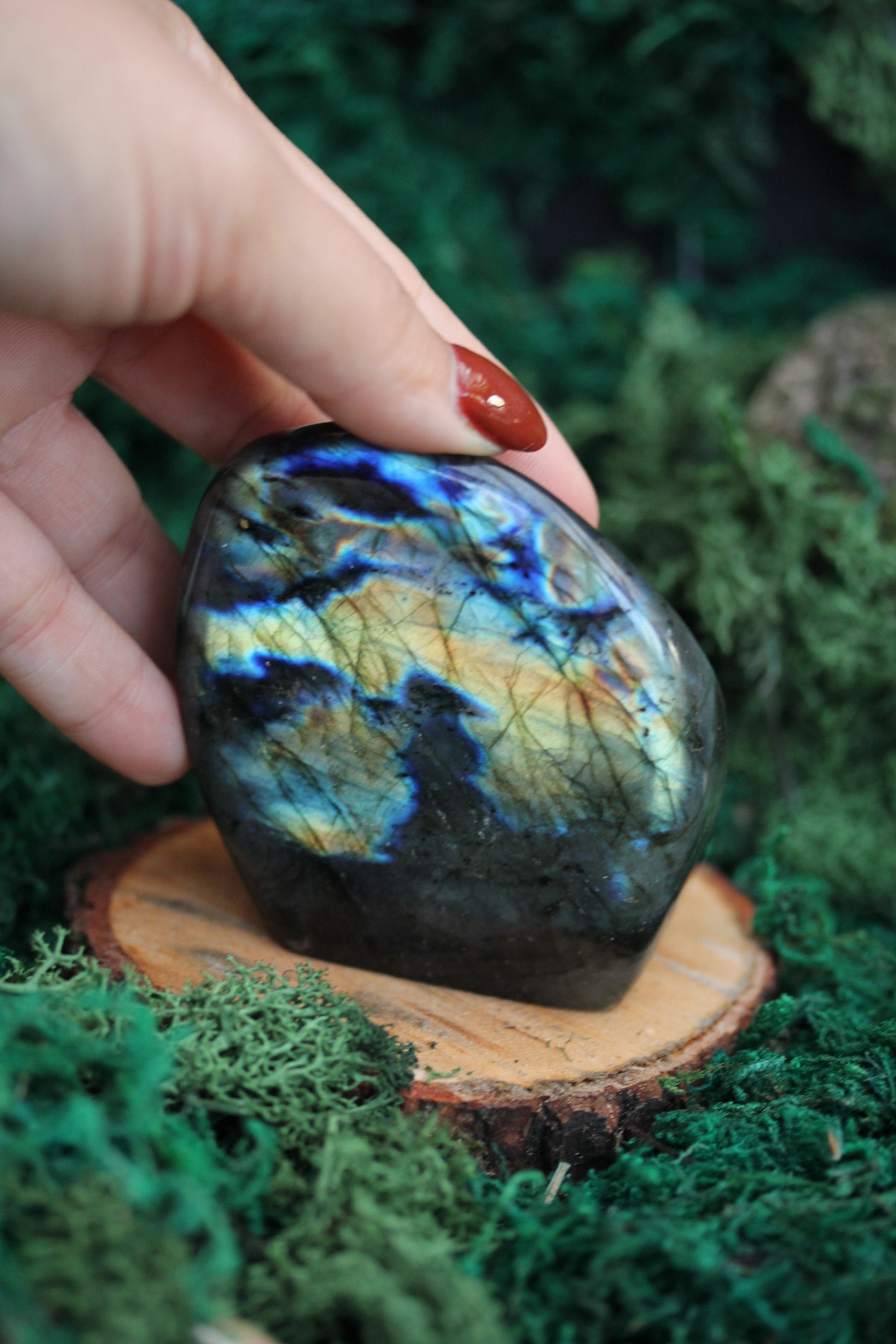 In the heart of a moonlit forest, nestled amidst ancient, whispering trees, there lies a hidden treasure, a Blue Labradorite Freeform Crystal that seems to hold the secrets of the cosmos. Its beguiling shades of blue are reminiscent of the serene lakes where legends of old speak of ethereal beings who danced upon the water's surface.